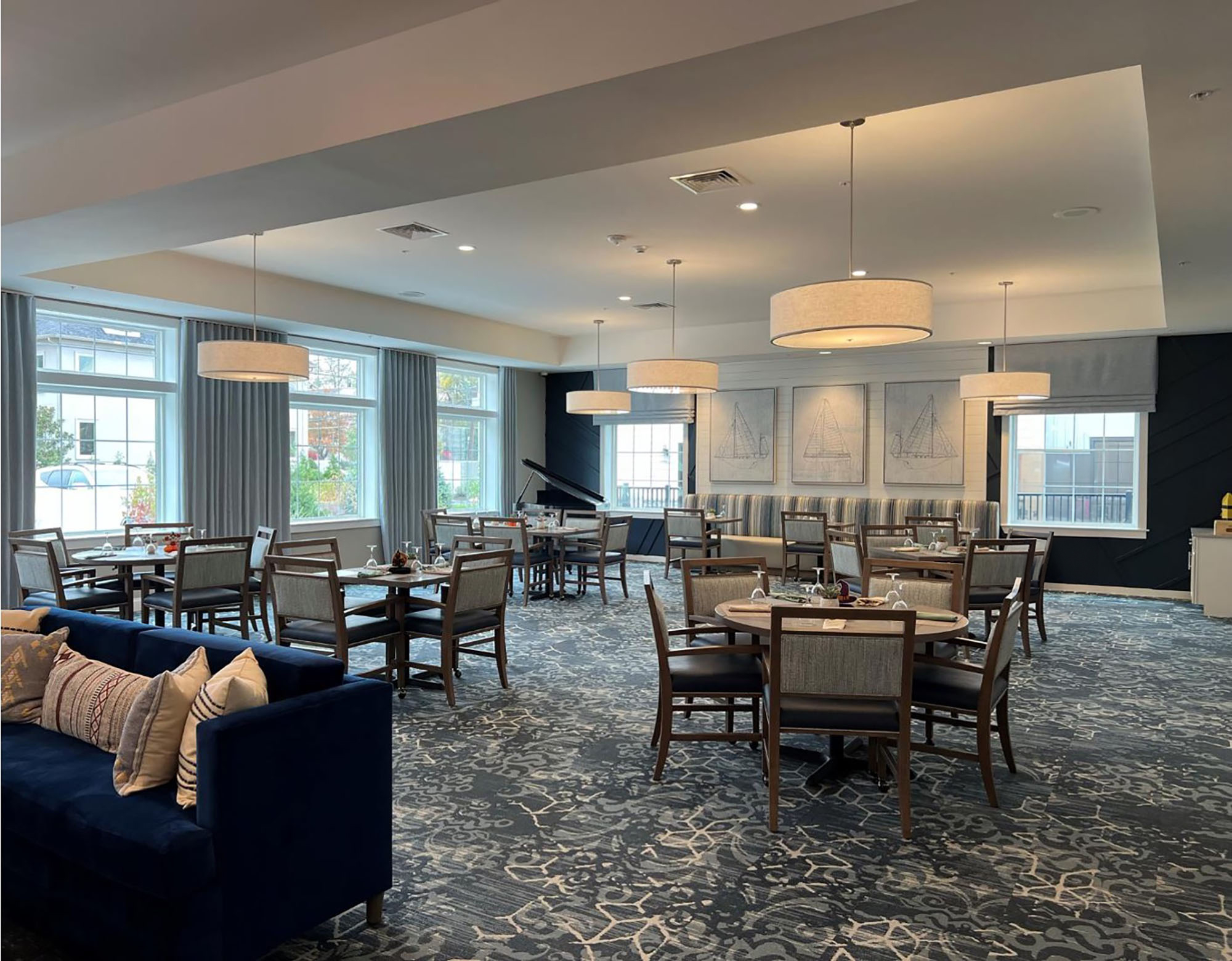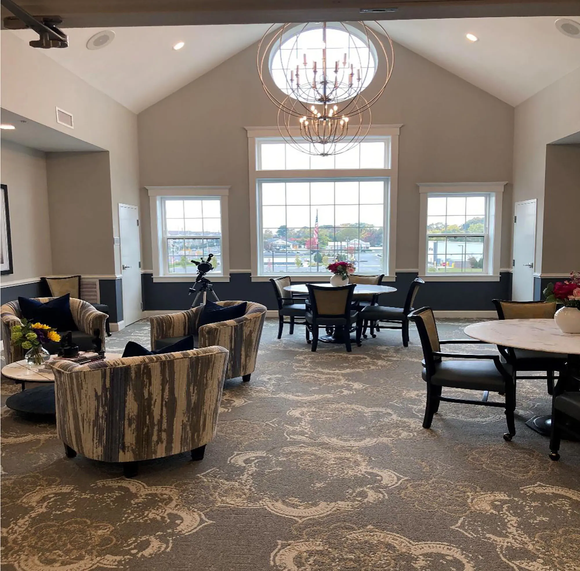Interiors are crafted to support the rhythms of daily life through spaces that feel both welcoming and purposeful. Social lounges and gathering spaces are positioned to foster connection and conversation, while thoughtfully designed library and arts/crafts areas invite quieter engagement. Dining venues and café-style settings warm energy with comfort, and dedicated fitness and wellness zones support active aging. Outdoor patios and landscaped seating areas further extend opportunities for movement and social interaction. Materials and lighting are selected for comfort, visibility, and everyday use, supporting wayfinding and operational efficiency while reinforcing an environment that feels reassuring, engaging, and attentive to the needs of residents, families, and staff.