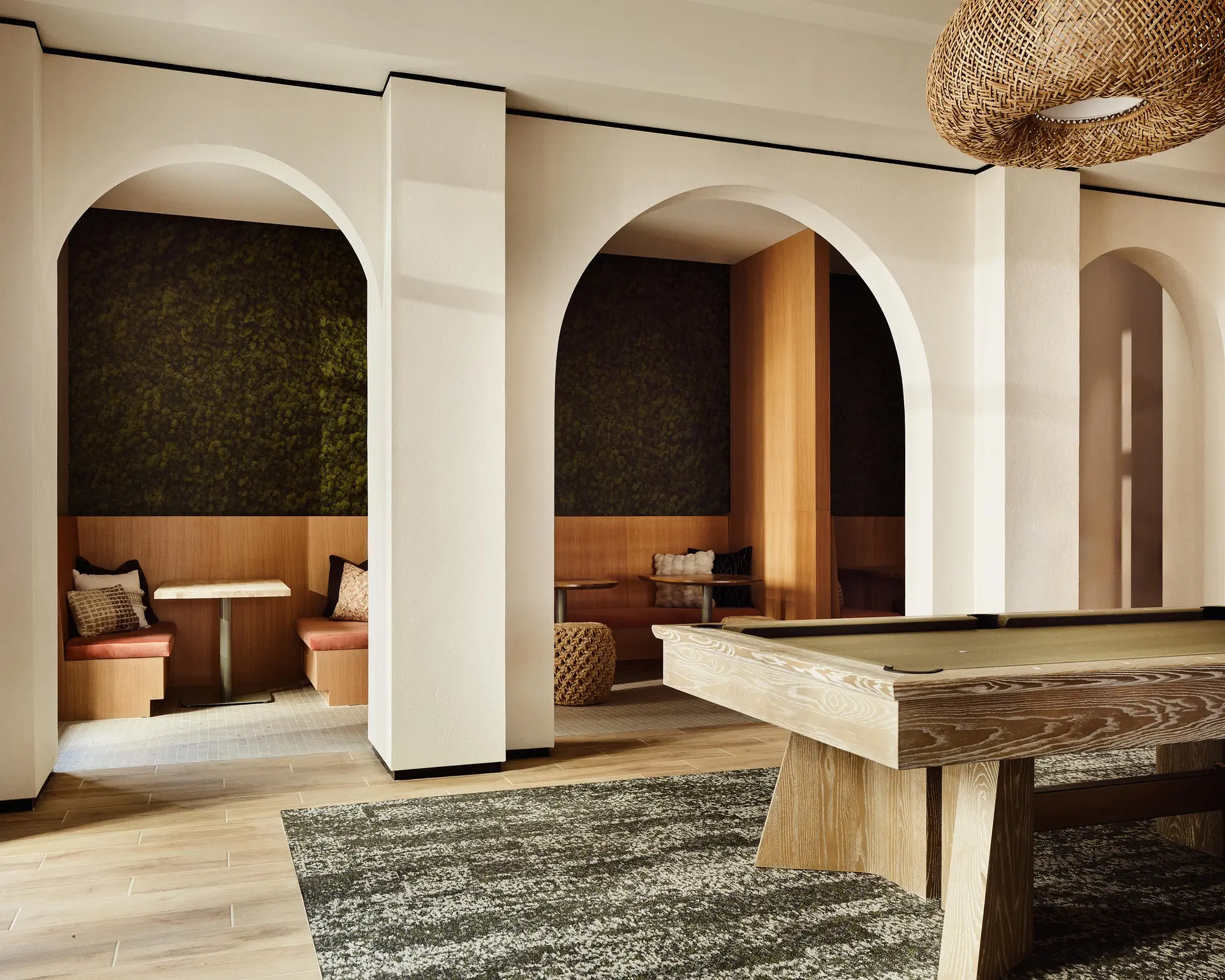 Amenity spaces were designed to support how residents work, gather, and unwind throughout the day. Co-working areas feel focused yet comfortable, lounges encourage social connection, and shared spaces balance openness with intimacy. Rich material contrasts and custom focal moments establish a clear design identity, while warm, durable finishes ensure everyday usability. The result is a cohesive community experience that strengthens leasing appeal and encourages residents to engage, linger, and return.