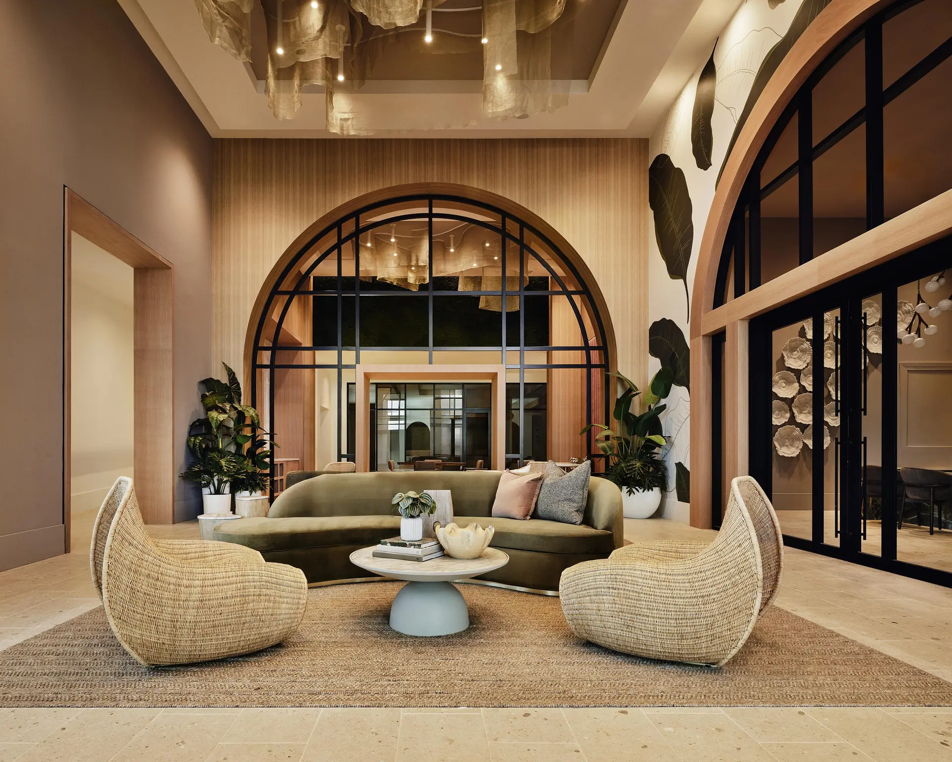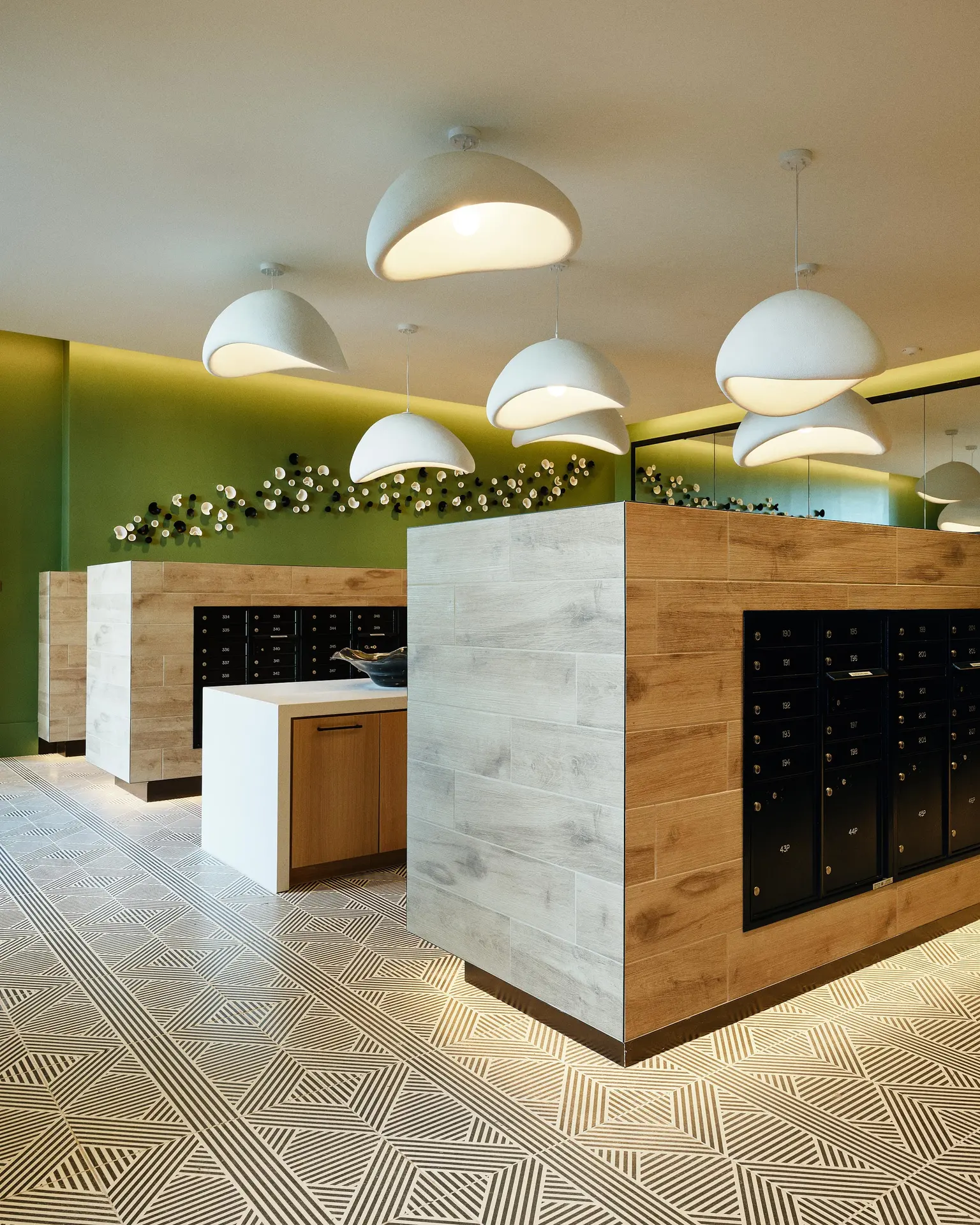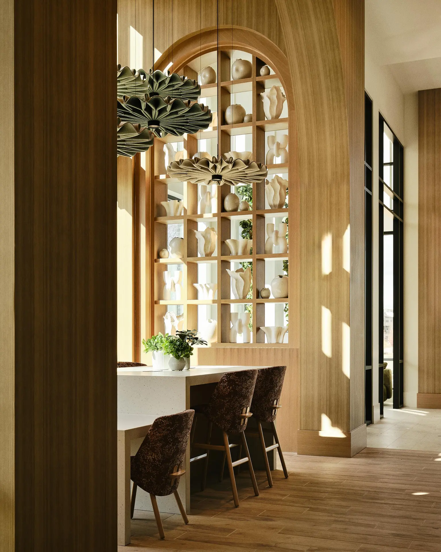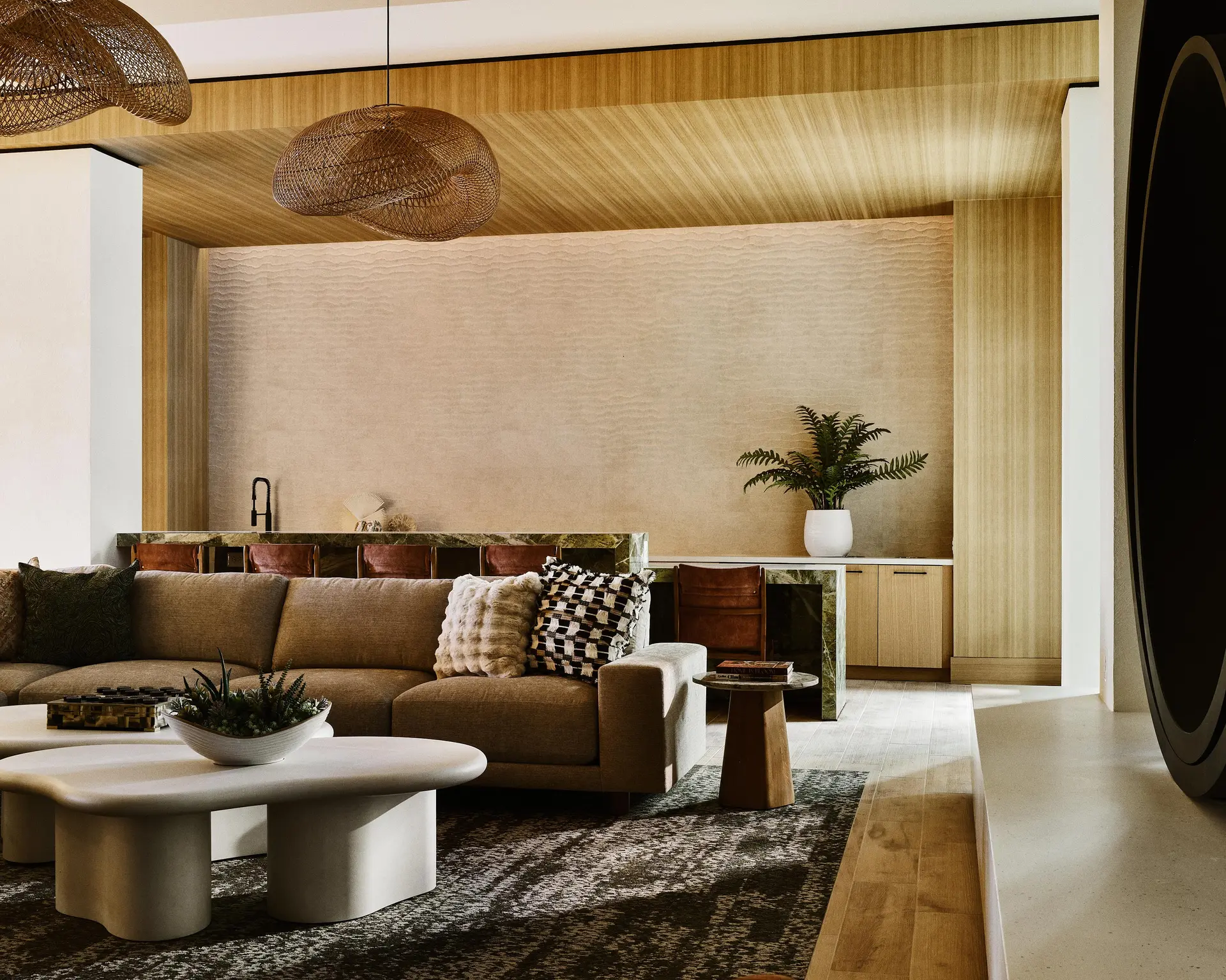 Textural material contrasts. Custom focal features. Residential warmth with durability.
